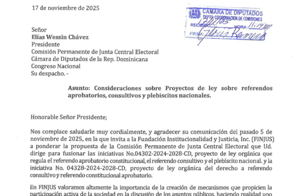 17 de noviembre de 2025 SeñorElías Wessin ChávezPresidenteComisión Permanente de Junta Central Electoral Cámara de Diputados de la Rep. Dominicana Congreso NacionalSu despacho. – Asunto: Consideraciones sobre Proyectos de ley sobre referendos aprobatorios, consultivos y plebiscitos nacionales. Honorable Señor Presidente; Nos complace saludarle muy cordialmente, y agradecer su comunicación del pasado 5 de noviembre de…