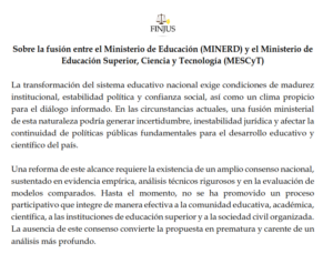 La transformación del sistema educativo nacional exige condiciones de madurez institucional, estabilidad política y confianza social, así como un clima propicio para el diálogo informado. En las circunstancias actuales, una fusión ministerial de esta naturaleza podría generar incertidumbre, inestabilidad jurídica y afectar la continuidad de políticas públicas fundamentales para el desarrollo educativo y científico del…